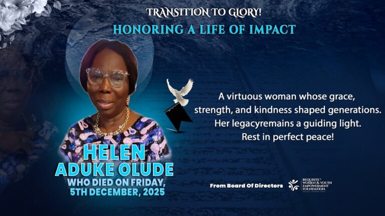 She was a loving mother, a graceful leader, and a pillar of compassion. As a Director of Requisite Women and Youth Empowerment Foundation, she uplifted the vulnerable and inspired hope wherever she went. Her life was a blessing, her memory a treasure, and her kindness a gift to many.